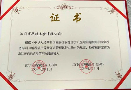 2017年10月,本公司之公司江門華津金屬制品有限公司(以下簡稱“華津”)及江門市華睦五金有限公司(以下簡稱“華睦”)收到江門市國家稅務(wù)局及江門市地方稅務(wù)局所頒發(fā)的《2016年度納稅信用A級納稅人證書》。